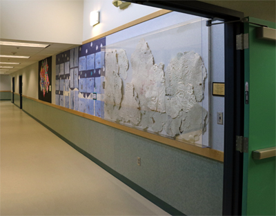 Artist Margaret Ahrens Sahlstrand created Silverdale's Children by casting images into cotton paper pulp. The pulp features three mineral pigments of off white, deep cream, and gray. Sahlstrand notes, "Five children's garments are represented arranged over three background panels, representing plant life in the area of the school. The salal in the right background panel was taken from the schoolyard, as was the huckleberry. The base panels represent plant and sea forms native to the area. Scattered through the piece are letters, animals, numbers and small real shells for the children to find and name."