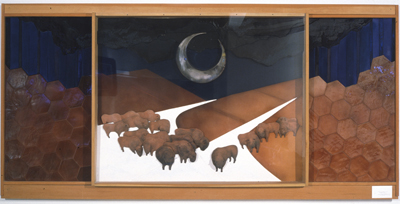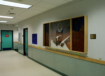 Artist Margaret Ford created Buffalos Seek Shelter on a Winter's Night using glazed ceramic tile. The three-panel artwork features abstracted landscape imagery and a herd of buffalo. She used white negative space to create the look of snow on the ground.