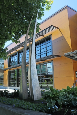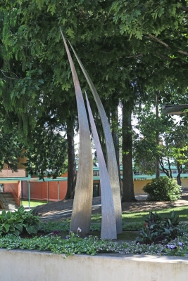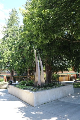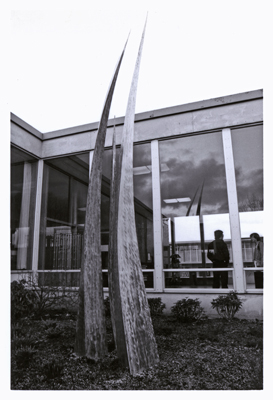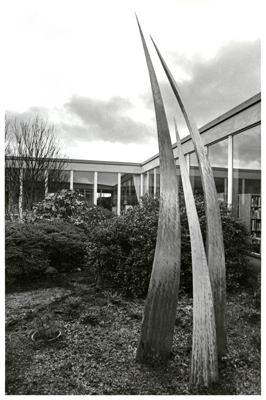 Artist Ali Baudoin was inspired by the form of a type of marine crinoid – a flowerlike sea animal known as a feather star. In 1987, this sculpture survived an arson on campus that destroyed Everett Community College's 40-year-old library and its collection of 48,000 books and periodicals. The artwork has since become a symbol of resiliency for the college.