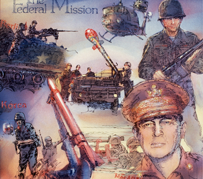 Military Images is an enamel mural created by artist John Killmaster for the Aberdeen-Montesano Armory. He chose imagery related to the history of the National Guard. He made the piece by first creating silkscreens based on drawings. He then screen printed enamel paint onto the panels and fired them in layers using a kiln. He then added painted and airbrushed elements.