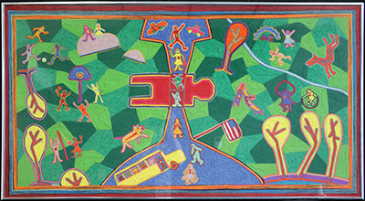 Recess is a textile artwork created by artist Macduff Everton. He created the composition using tightly packed rows of colorful yarn. The abstracted scene features children playing at recess in a schoolyard.