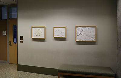 Forest Floor Variation II is a cast paper print created by artist Margaret Ahrens Sahlstrand. She places wet paper pulp around a printing plate collaged with objects and uses a vacuum table to pull the pulp into the surface of the plate. Objects found on the forest floor—such as fir cones, ferns, and other leaves—were used to mold the handmade paper artwork. It is an unconventional, minimalist portrait made out of all natural, biodegradable materials.