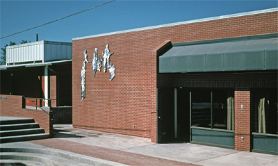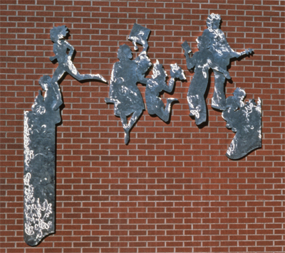 Artist Brian Henderson created this steel sculptural relief to celebrate the academics and activities at Othello High School. The composition serves as inspiration for Othello's aspiring students. The silhouetted figures represent science, athletics, oration, music, and agriculture. The central figure is a graduate tossing their hat in the air.