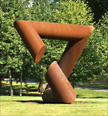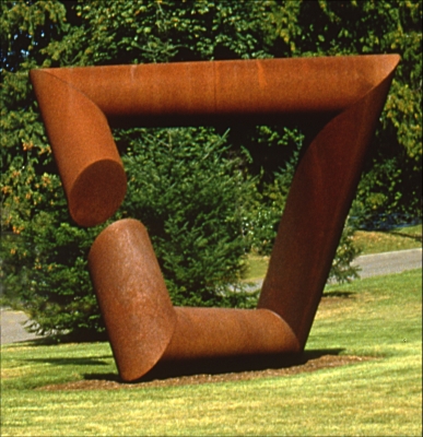 This large scale steel sculpture is part of artist Ted Jonsson's body of abstract sculptures that investigate geometric forms. This trapezoid shape is composed of skewed angles and explores concepts of illusion, balance, and perspective. Jonsson notes that the basis of his work is "using less to achieve more, a refined simplicity of form devoid of ambiguity."