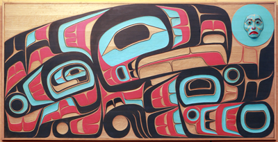 Native American artist Marvin Oliver's (Quinault/Isleta) hand-carved and painted cedar panel Raven and the Moon is part of his body of sculptures that celebrate Northwest Coastal tradition and culture. Oliver created the panel using Indigenous Northwest Coast designs, colors, and motifs. Raven is a common character in Pacific Northwest creation stories and is often a trickster and shape-shifter.