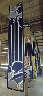 Banners is a textile installation by artist Joellen Benjamin-Fay. It is comprised of fourteen graphic banners. The artist created each colorful banner by layering and sewing contrasting colors of cotton canvas.