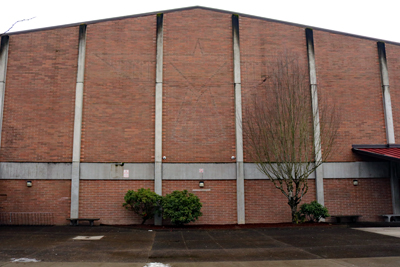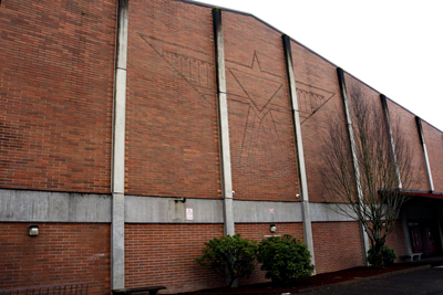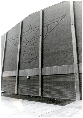 Artist Kay Slusarenko sandblasted Prairie Falcon into the brick façade at Prairie High School. She designed the stylized bird motif to symbolize the Prairie Falcon, a bird of prey found in arid environments. The subtle image changes throughout the day based on how sunlight and shadows fall.