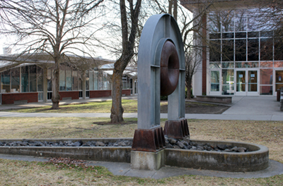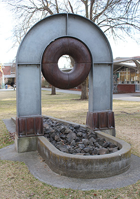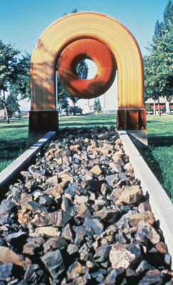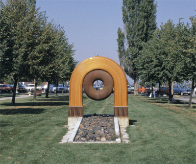 Thomas Lindsey's Prayer Wheel Series sculptures focus on the symbolism of cycles. He notes, "I feel that it is increasingly important for human beings to recognize that we are all bound together within the fabric of the universe, and that one common denominator to all things is the cycle." Lindsey created the original arch by steaming and bending strips of redcedar wood, supported by concrete. He created the doughnut shape, called a torus, by welding together four pieces of steel pipe. The sculpture spans an oval form on the ground filled with river rocks. In 2002, the artist worked with ArtsWA and Spokane Falls Community College to re-design the wood arch to resist deterioration. He replaced the wood elements with galvanized steel.