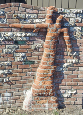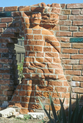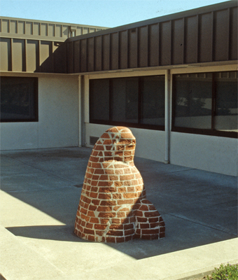 Breakthrough is a two-part brick sculpture created by artist Richard Corrin for the courtyard at Point Defiance Elementary. This fanciful installation sparks the imagination and encourages play. For the large curved wall, Corrin encouraged students to bring in small found objects. The students helped him place these objects, including shells, stones, and small toys, into the bricks as he constructed the wall. The wall also features carved figures and a tree form. Peering through a hole in the wall, you can see a carved brick beluga whale appear to breach the surface of the concrete patio. The artist notes, "All children have the ability to visualize, or make their dreams come true, to create the future that they want for themselves. The educated person has a better chance at breaking through barriers or problems that we all face at times." He continues, "The future holds many secrets from the Earth's creatures, and it is the duty of our children to be educated and aware of the face that Planet Earth is our fragile home and we must preserve it for the generations to come."