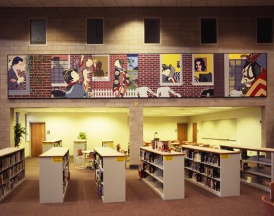 'Look White I Found!' is part of a series of three wall installations created by artist Dan Snyder for Stanley Elementary. He filled the wall with colorful and joyful painted figures and images. He based some of the images on drawings created by students at Stanley. In this piece, leaping figures, stars, and animals appear to jump out of an open book.