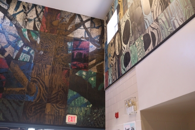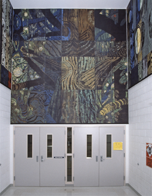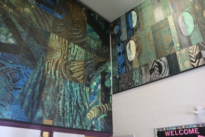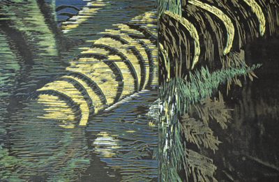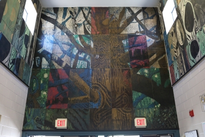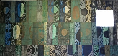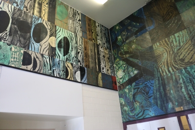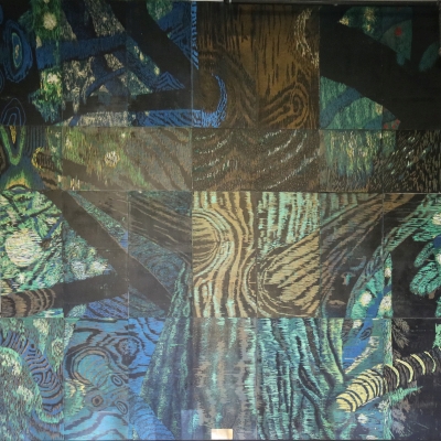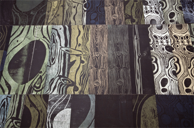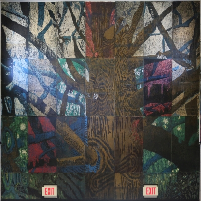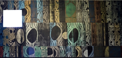 Jody Isaacson's mural installation Protection is comprised of four large-scale panels that feature woodcut printed imagery of natural and abstract forms. The resulting composition creates an encompassing, richly detailed and expressive panorama.