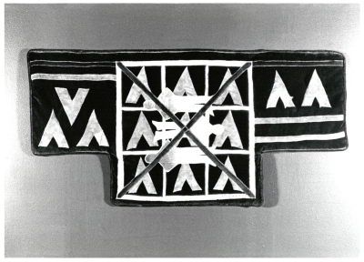 Just Another Village is a tapestry created by artist Dana Boussard. The imagery features human figures and teepee forms amid bold geometric designs. She created the composition using different layers of dyed velvet and canvas. She notes, "The Plains Indians were warriors as well as nomads and hunters. Just Another Village represents a record kept by the winning Tribe after a successful battle over another Indian camp. At the end of a battle, it was customary for this winning Tribe to make a brag skin, or a pictorial story of the battle. In this brag skin, the teepees are symbolically depicted right side up and upside down showing the chaos of that battle. The stripes along the sides tell that the defeated camp lay on a river."