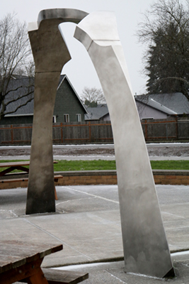Artist Tom Morandi created Passage for Cascadia Technical Academy. The curved archway greets students and teachers entering through the courtyard. The top of the arch features a double curve that suggests the bends of a river and other natural curves.