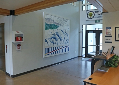 Glacial Rhythms by Pamela Harlow is an enamel mural comprised of 53 sections. She created the imagery by firing painted enamel onto copper sheets in a kiln. Describing the ideas and imagery in this piece, Harlow notes, "Year by year, snow gathers. Small annual increments knit together, building depth, until snow fuses into ice and the sheet of ice begins to flow. As it moves, transverse crevasses open, offering ragged glimpses into blue depths, the heart of the glacier."