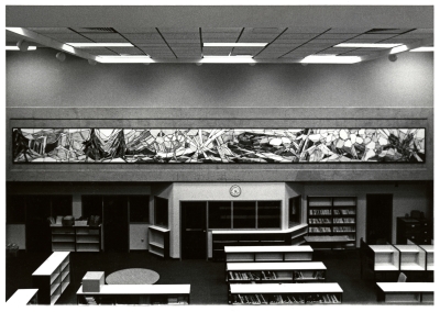 Artist team Robert Hill and Jill Hill created this glass mural for Naches High School. The abstracted landscape design suggests mountain, sea, and forest imagery. They constructed the mural by cutting colored glass into shapes in a technique similar to stained glass.