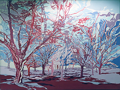 Artist Marlo Sass created this piece as part of Searching for a World Unknown, Yet Forever Being Born, a group of two-panel landscape paintings. Each painting features a unique combination of colors. The color story in each painting suggests different seasons and moods.