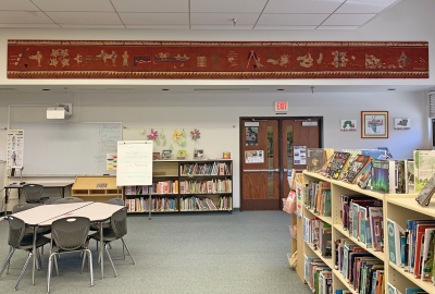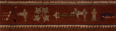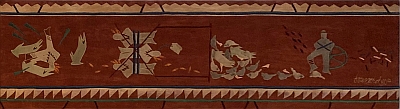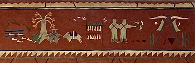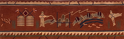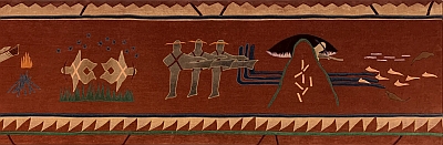 Seeing Comes Before Words...A Legend in Time is a two-part fabric mural. Artist Dana Boussard created the mural for Tapteal Elementary School in Richland, Southeastern Washington. The imagery tells the story of the interactions between Native American peoples and white settlers to Southeastern Washington starting in the 1860s. The panels show the white settlers' journey west, first encounters with Native Americans, the struggle to coexist, and the growing number of settlers encroaching on Indigenous lands.