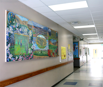 Artist John Killmaster created this painted mural for Selah Middle School. Installed in the Library, it is comprised of three panels. The mural celebrates the fruit-growing industry in Selah Valley. The first panel shows downtown Selah in spring. The second panel features an image of Mount Adams in summer. The third panel contains mountain and canyon views at harvest time in Selah.