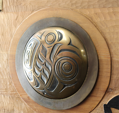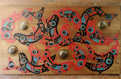Salmon is a carved and painted cedar wood sculpture by late Native American artist and master carver Marvin Oliver (Quinault/Isleta). He used traditional Northwest Coast designs, colors, and motifs. The active composition features formline salmon surrounding circular cast bronze reliefs.