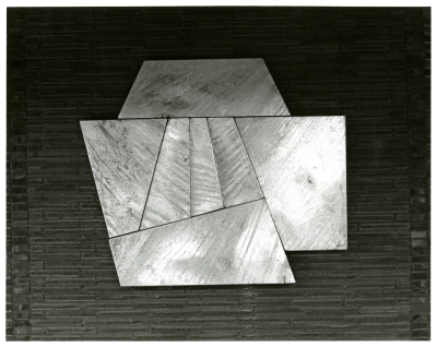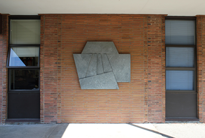 Bonnie Bronson’s steel wall sculpture explores structure and symmetry. She created a textured surface on the seven unique quadrilateral shapes instead of adding color. The artwork is balanced yet asymmetrical. It has an organic element to it but is made of sharp angles, straight lines, and man-made metal. It looks flat but is all slightly angled surfaces when we look more closely.