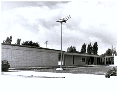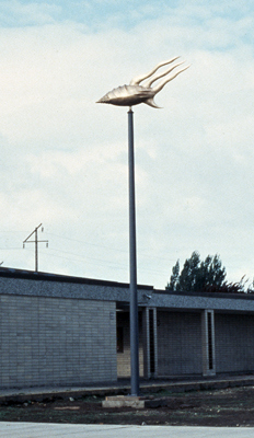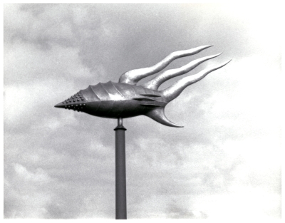 Artist Keith Jellum created the sculptural weathervane Windship for Bellingham Technical College. He created the design based on drawings and models made from clay and plaster. This whimsical piece seems to combine references to spaceships and animal forms.
