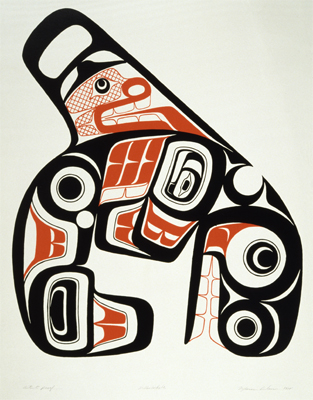 Late Native American artist Marvin Oliver (Quinault/Isleta) describes his works as "formulated by merging the spirit of past traditions with those of the present...to create new horizons for the future." This silkscreen print, in traditional Northwest Coast styles and colors, depicts an orca. Oliver is represented in the State Art Collection by more than 20 works, ranging in scope from small works on paper to large-scale commissioned sculpture.