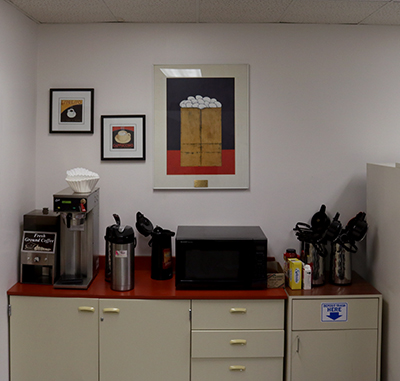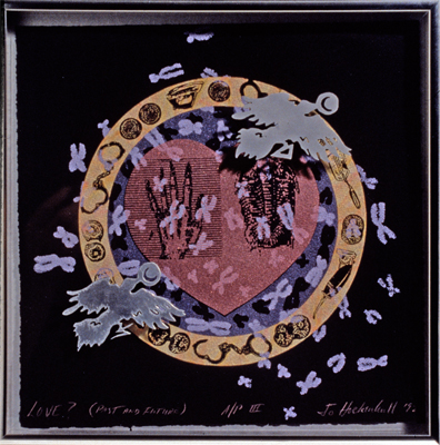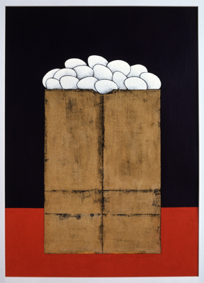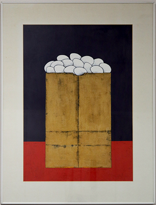 Late artist Jackie Watson created Large Bag with Eggs using an ink resist technique. In this painting method, she blocked out areas of color using water-soluble paints. She then filled the entire image with India ink. Once everything dried, she ran the painting under water, which dissolved the areas protected by paints. She then filled in the protected areas with colorful paints to complete the composition.