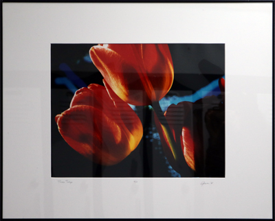 Three Tulips is part of artist Peggy Gruen's series of ten photographs. These artworks combine vibrantly colored images of natural objects with a digital, abstract background. She chose each object based on its bold shapes and unique form. Peggy Gruen created this series for Multiples: The Sciences and Art (1991), an exhibition of ten micro-collections commissioned to tour Washington State school districts. The micro-collections offer different perspectives of ten artists exploring ideas and issues related to science, and ask students to re-consider assumed and widely accepted aspects of science.