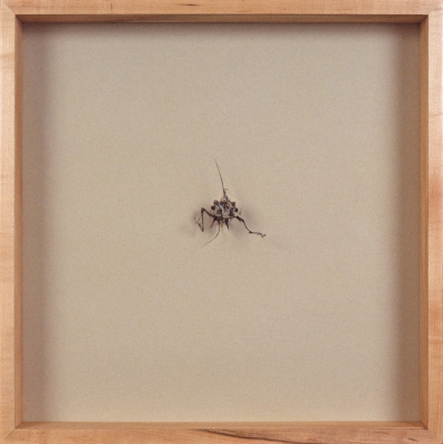 Artist Jim Rittimann investigates the boundary between the natural world and our creative imagination. This piece is part of artist Jim Rittimann's delicate, complex, and fascinating "Reconstructions" series. To make this creature, the artist first gathers found insect and animal bones and fragments. He cleans these fragments using live beetles (a technique used by natural history museums). He then reimagines and combines the fragments into new, fanciful creatures and figures. Jim Rittimann created this series for Multiples: The Sciences and Art (1991), an exhibition of ten microcollections commissioned to tour Washington State school districts. The microcollections offer different perspectives of ten artists exploring ideas and issues related to science, and ask students to re-consider assumed and widely accepted aspects of science.