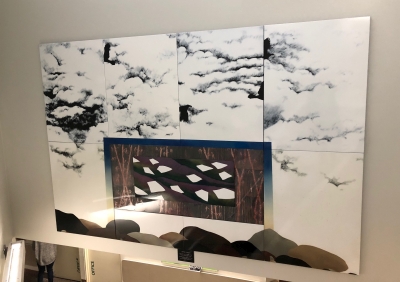 Sky Warp with Traveler is an enamel painting created by artist Pamela Harlow. The abstracted landscape imagery comprises ten sections. She left large areas of the copper sheeting exposed in the center section. This rich, textural surface contrasts boldly against the glossy enamel.
