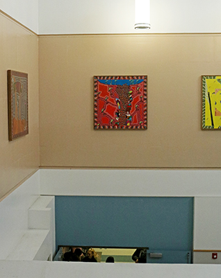 ‘Skid Row, Seattle’ by dick ibach depicts an acid-bright colored landscape of land, small houses, isolated trees, and a slice of intensely azure blue water. The area is Seattle’s Yesler Way road which in the 1800s was a literal “skid road” of logs skidding downhill to Puget Sound. Seattle’s skid road is the source of the term “skid row” meaning a poor, seedy neighborhood. But only the title references “skid row” – the imagery is colorful and tidy, with two rows of simple, multi-colored houses. ibach’s trademark, zigzag patterns mark the road and its logs and form a border around the scene.
