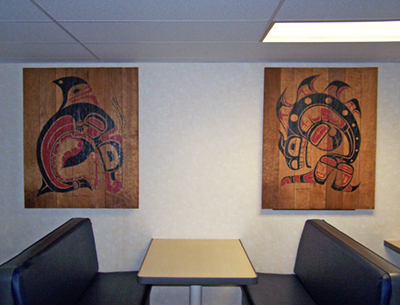 Non-Native artist James Jordan created Sea Monsters for the MV Issaquah, a Washington State Ferry. Many elements of the artwork are based on traditions from the Indigenous Northwest Coast peoples. The painted sea monster figure is based on Northwest Coast curved and ovoid formline designs. The cedar boards were hand-carved with an adze, in the style of Northwest Coast carvings. Jordan notes that this piece "depicts the Haida [First Nations] legend of the five-finned killer whale. These stories probably evolved based on sightings of schools of these sea giants by fishermen."