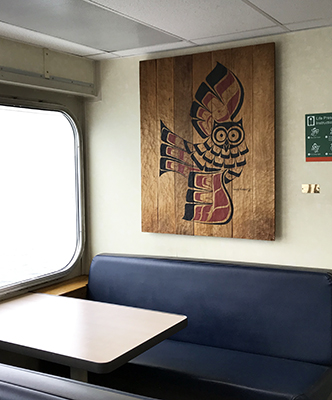 Non-Native artist James Jordan hand-carved and painted Owl for the MV Issaquah, a Washington State Ferry. Many elements of the artwork are based on traditions from the Indigenous Northwest Coast peoples. The painted owl figure is based on Northwest Coast curved and ovoid formline designs. The cedar boards were hand-carved with an adze, in the style of Northwest Coast carvings. Jordan notes that the owl is a common mythological figure for all Northwest Coast Tribes: "The owl often represented a spirit helper of the Shaman. In legend, the Owl was often the bringer of messages and warnings from the spirit world."
