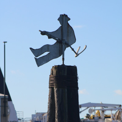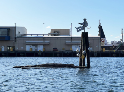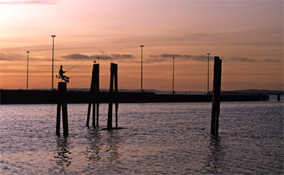 'Fishing Silhouette' is a steel sculpture created by artist Buster Simpson. It is located on a piling in Elliott Bay near Downtown Seattle. You can spot the sculpture from the walking trails in Elliott Bay Park.