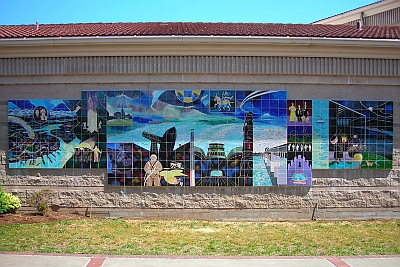 Wenatchee Quilt is a ceramic tile mural created by artist Maggie Smith. It combines a geometric quilt pattern with plant and animal images. The landscape surrounding Wenatchee in Central Washington inspired her imagery.