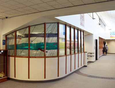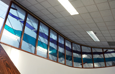 Logos is an installation of ten stained glass windows created by glass artist Maya Radoczy. The title refers to the Greek word for order and logic in the cosmos. The composition imagines a world of subatomic particles, elementary parts of the world that are smaller than atoms. The artist notes, "The diagonal lines and spinning lines of energy suggest particles as they are seen in cloud chamber photographs taken by physicists."