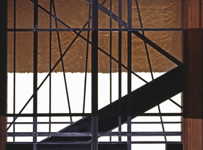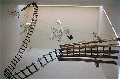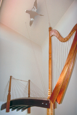 SkyBridge by artist David Griggs is a three-part, hanging, sculptural installation that fills the three central atriums of the school. SkyBridge references Pasco’s history and legacy, as well as several unique features of the area in Southeastern Washington. The city of Pasco is located on the Columbia River, and a unique cable-stayed bridge connects Pasco to its neighboring communities. Pasco is also on the Pacific Flyway, which is used by birds from Canada on their annual migration journeys North and South. The surrounding area has an important history of commerce as the most inland barge-to-rail port on the Columbia River. Each atrium features a bridge made from laminated wood beams and wood towers, connected with cables. Acrylic mirror-glass birds are set into the ceiling at various angles to reflect light into the atriums. The East Atrium features a harp made from wood and vinyl coated wire. The West Atrium features railroad tracks and ties made from redwood.