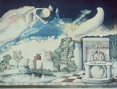 Forgotten Factor is a print by artist Vivian Torrence. This piece celebrates Halley's Comet, visible from earth in early 1986. She notes, "I have personified the comet as a woman with long, 'glowing' hair (the origin of comet [in Greek] the word Kometes means long-haired). She spreads her inspirational light through our sky on her journey through the galaxy. She desires not to be a Forgotten Factor by the mathematician preoccupied by his calculations and predictions. Chaos and order are both factors." Master printer Barbara Telleen printed this lithograph at the Iowa State University Print shop.