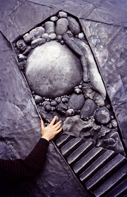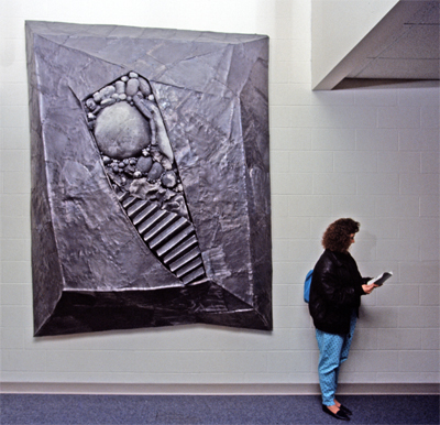 Far Away Places is a wall relief sculpture created by artist Mike Taylor for Wenatchee Valley College. The abstract imagery features a central cavity filled with a large spherical shape, stones, and a stair-like form. Its textured surface highlights the play of light and shadow.