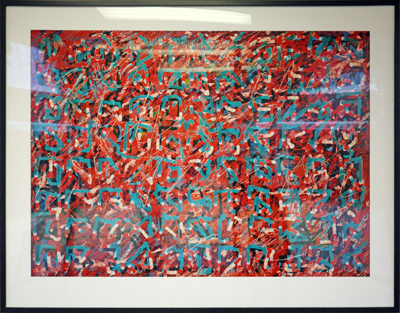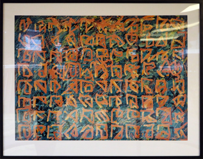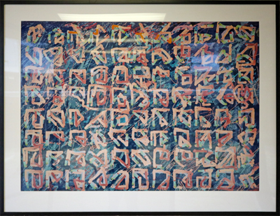Language in Nature: Night, Foliage, and Fire by artist Lorna Jordan is a series of three colorful and highly patterned, abstract photographic prints. Jordan created grids of computer-generated patterns and characters as a way to expore abstract, symbolic forms. These artworks are early examples of art made with computers. Jordan's computer drawings were created on a Macintosh IIx computer (sold from September 1988 to October 1990). The digital images were shot onto 4"x5" Ektachrome film and projected onto Cibachrome photographic mural paper.