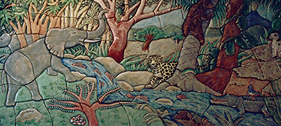 Artist Gordon Bryan created Fawcett School Animal Mural to spark imagination about animals and the natural world. He created this ceramic relief mural by first drawing the design on paper. He then traced the design onto big slabs of clay. He carved the images into the clay to create a sense of depth and dimension.