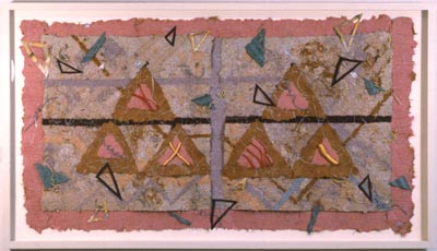 Dreams of a Chippewa Past is a collage created by artist Wendy Franklund Miller using handmade paper, willow sticks, and screen printed shapes. It is part of her "Chippewa Myth Series" of artworks. The series is based on her memories and experiences growing up in North Dakota. She was told as a child that she had ancestors from the Chippewa Tribe, but she discovered as an adult that she did not have any Native American heritage. The series investigates her identity and imagination. She notes that this piece "symbolizes fragments of dreams of an Indian life lived many lives before this one."