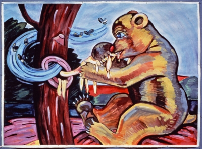 Bear Cub Stealing Honey is an example of artist Donna Mossholder's exploration of opposites and duality. She notes, "I keep returning to the Bear Stealing Honey image in various forms, possibly because it epitomizes the notion that there are two sides to every issue. When the bear steals the honey, he receives both the pleasure of the sweet treat and the pain of the bee's sting at the same time."
