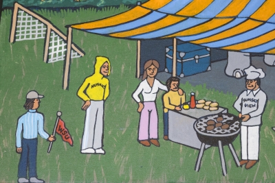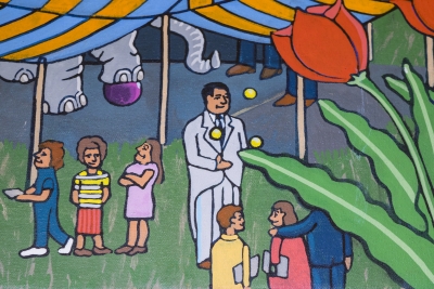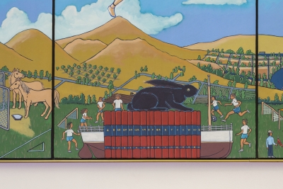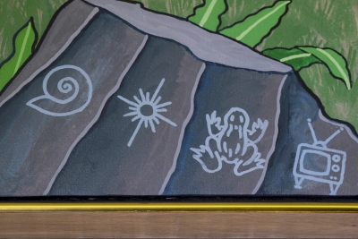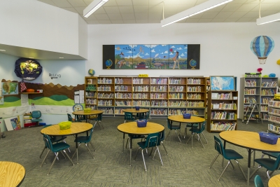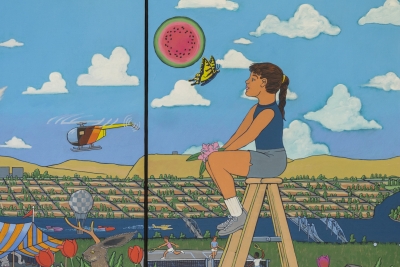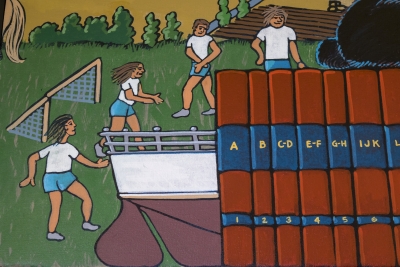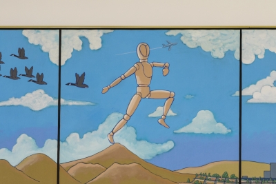 Artist Frank Samuelson created the mural See, Play, Learn, Grow to celebrate the learning environment. Two blackboard-style panels frame each side of the mural. He filled the composition with images of the Eastern Washington community and landscape.