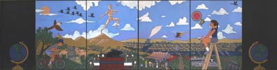 Port Townsend-based artist Frank Samuelson creates colorful and imaginative paintings and murals for pubilc spaces. The natural world is an important theme and inspiration for Samuelson who notes: "Moving and playing with form and color are just a thrill that I can’t deny myself. The essence of water is also an important piece of all puzzles I paint."Samuelson received Bachelor of Arts and Master of Arts degrees from Central Washington University in Ellensburg. He received a Master of Fine Arts degree from Washington State University in Pullman, Eastern Washington, in 1976. He lives and works in Port Townsend, on the Olympic Peninsula in Northwest Washington.