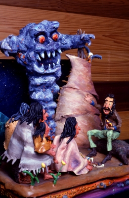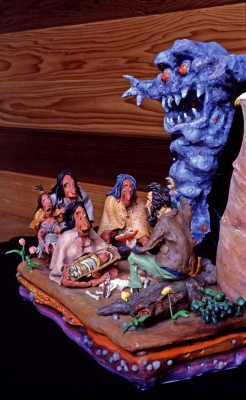 This sculpture is part of a series of four clay artworks created by artist Patrick Amiot. The sculptures are inspired by the history of the Tumwater area and the legacy of Michael T. Simmons, one of the first white settlers on Puget Sound. Simmons arrived by wagon train in the 1840s and was a founder of the new settlement that they named New Market (now Tumwater). This artwork shows a scene in which Simmons and Nisqually people share stories around a campfire. The smoke of the campfire has come to life as a fantastic monster.