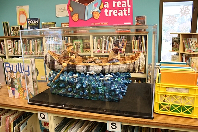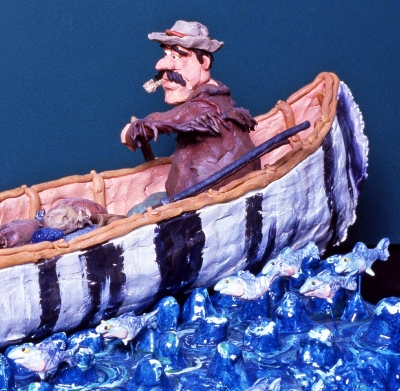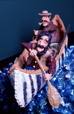 This sculpture is part of a series of four clay artworks created by artist Patrick Amiot. The sculptures are inspired by the history of the Tumwater area and the legacy of Michael T. Simmons, one of the first white settlers on Puget Sound. Simmons arrived by wagon train in the 1840s and was a founder of the new settlement that they named New Market (now Tumwater). This artwork shows two white men in a birchbark canoe, navigating a river filled with fish.