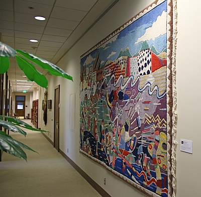Here and There is a large-scale woven rug designed by artist Carl Chew. Rug makers fabricated the piece in Kathmandu, Nepal. They use naturally dyed Tibetan wool in different colors, weaving it by hand on a large wooden loom. The artist created the colorful design using a computer graphics program. He notes, “When the designs are made into rugs, they go through six stages, including slides and inkjet prints of the computer art, tracings, graphs, and hand-coloring.”