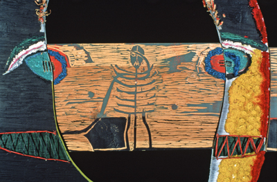Ship and I is a painted and carved wooden sculpture by artist Jody Isaacson. She notes, "I used a ship to carry my thoughts as they passed through my head. The black U shaped head felt like myself and the images carved into the wood ship told the narrative that I was attempting to insert in my work. The narrative theme has to do with communication and break down of communication."