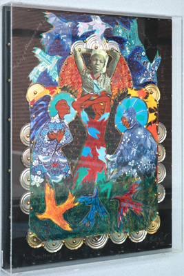 Artist Janet Taylor Pickett explores her personal history and ancestry in Sanctuary. The artwork is composed of vivid images, as well as mythical symbols and art historical references. Painting, drawing, collaged elements, and found objects such as upholstery tacks and tin can tops are all used.
